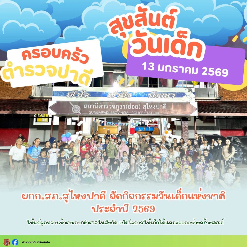 “รอยยิ้มของลูกหลาน คือกำลังใจของครอบครัวตำรวจ” ผกก.สภ.สุไหงปาดี จัดกิจกรรมวันเด็กแห่งชาติ เพื่อเป็นการสร้างขวัญและกำลังใจให้แก่ลูกหลานข้าราชการตำรวจ เปิดโอกาสให้เด็กได้แสดงออกอย่างสร้างสรรค์