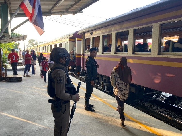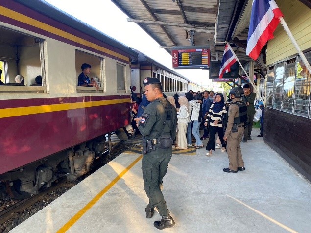 วันที่ 31 ต.ค.67 เวลา 06.30 น. ภายใต้การอำนวยการของ ว่าที่ พ.ต.อ.อัสรี ต่วนเพ็ง ผกก.สภ.สุไหงปาดี , พ.ต.ท.วสันต์ พันธ์โภชน์ รอง.ผกก.ป.สภ.สุไหงปาดี สั่งการให้ ด.ต.อนุชา ขุนทองเพ็ชร ปฏิบัติหน้าที่ร้อยเวร 2-0 พร้อม ชป.เคลื่อนที่เร็ว , เจ้าหน้าที่รถไฟ ว.4 รถไฟขบวน 448 สุไหงโกลก – สุราษฎร์ธานี เพื่อป้องกันเหตุ ดูแลความปลอดภัยและอำนวยความสะดวกให้แก่ผู้ที่มาใช้บริการรถไฟ เหตุการณ์ทั่วไปปกติ