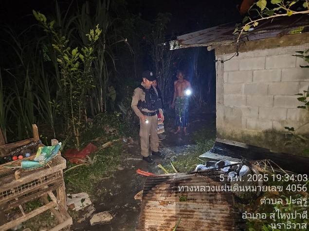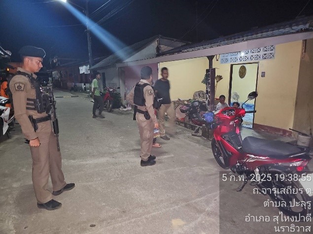 วันที่ 5 ก.พ.68 เวลา 19.30 น. ภายใต้การอำนวยการของ ว่าที่ พ.ต.อ.อัสรี ต่วนเพ็ง ผกก.สภ.สุไหงปาดี สั่งการให้ ด.ต.อนุชา ขุนทองเพ็ชร ปฏิบัติหน้าที่ร้อยเวร 2-0 พร้อม ชป. เคลื่อนที่เร็ว ว.4 เหตุบุคคลคลุ้มคลั่ง ซอยโคกปริเม็ง ต.ปะลุรู อ.สุไหงปาดี จ.นราธิวาส ผลการปฏิบัติ ไม่พบตัวบุคคลคลุ้มคลั่ง