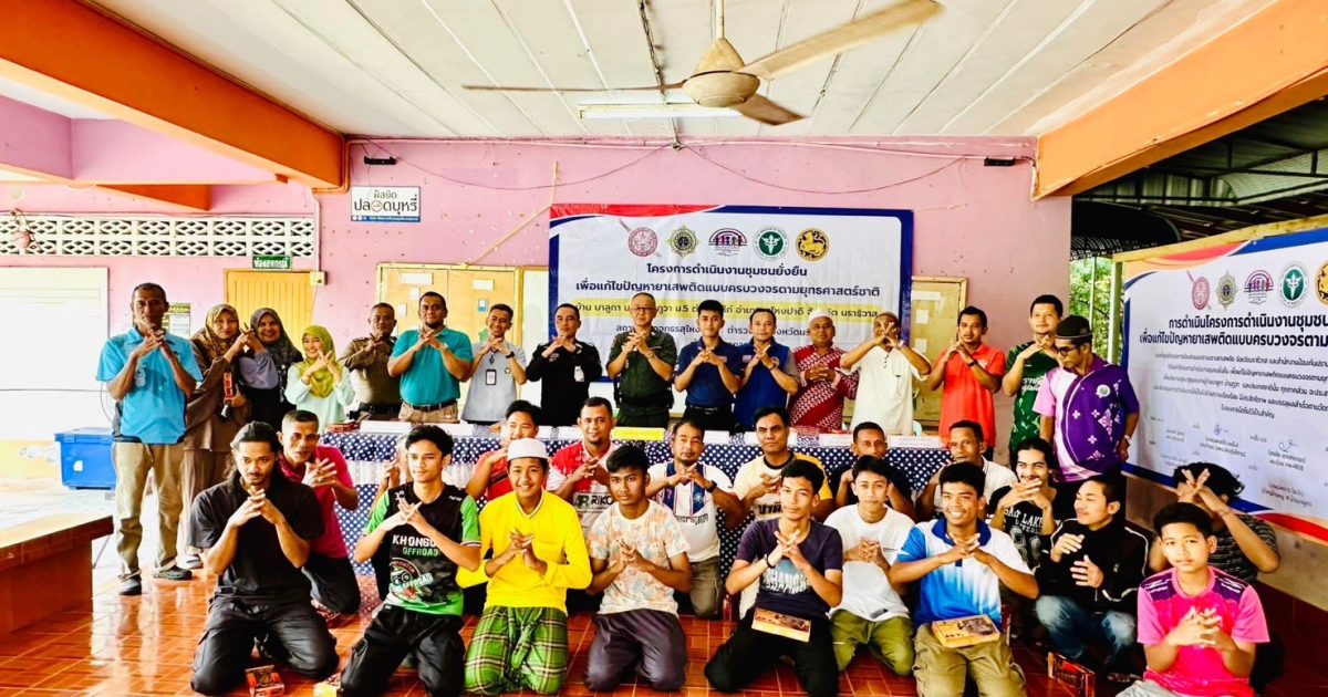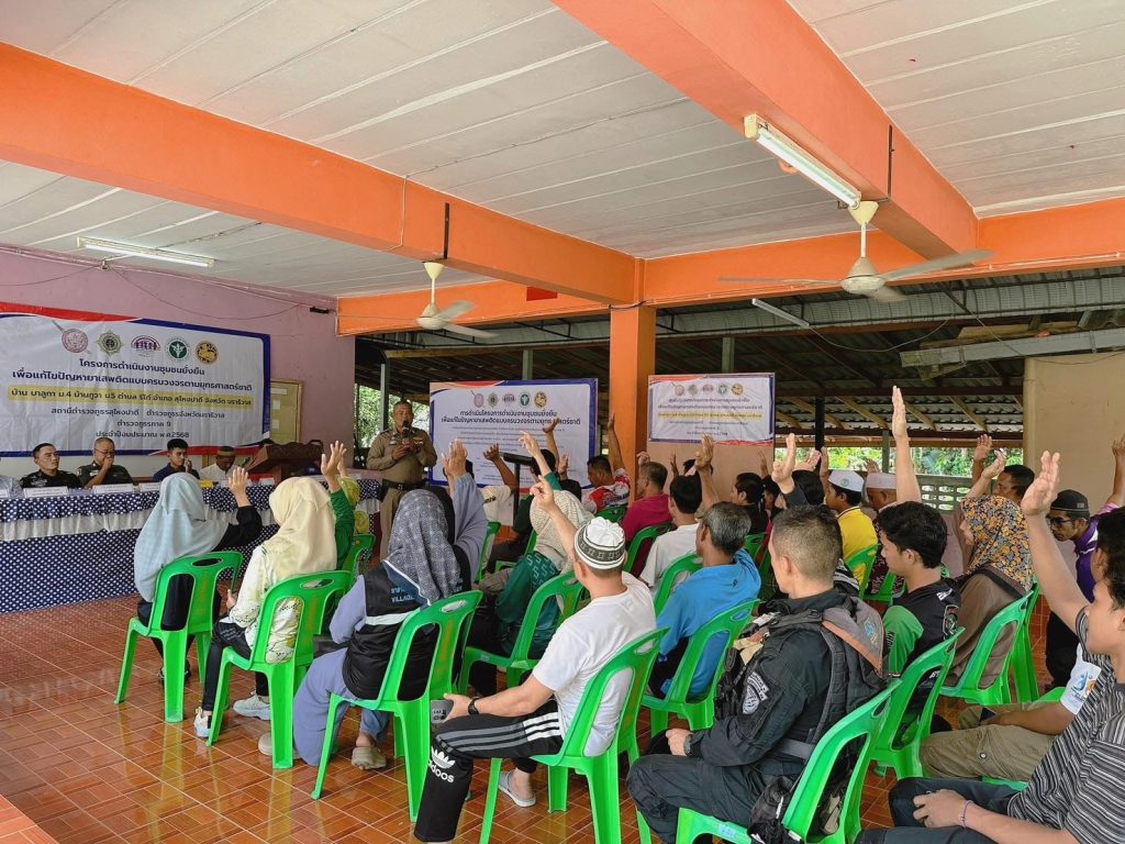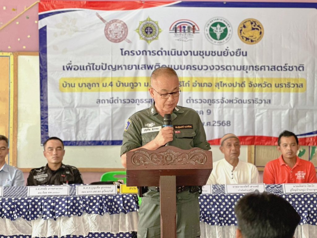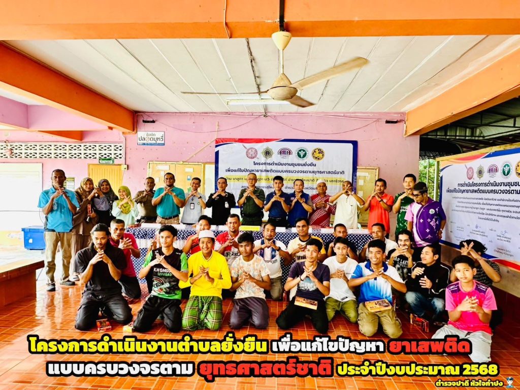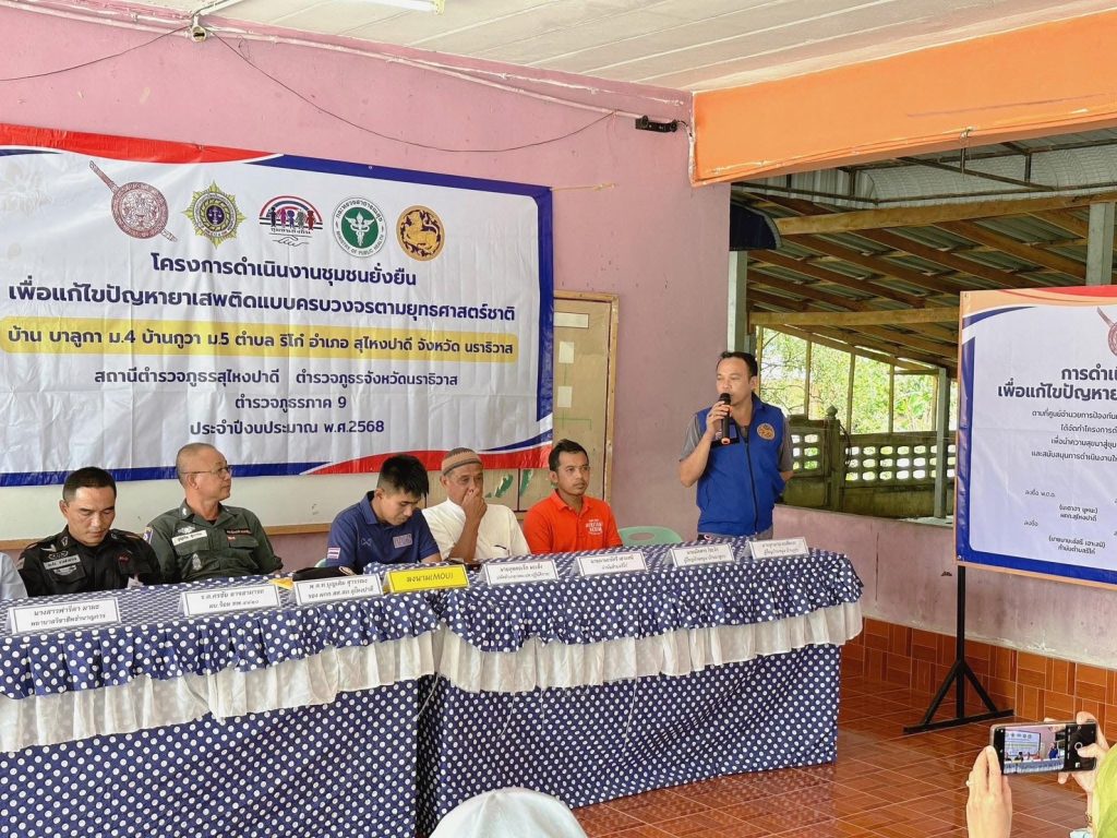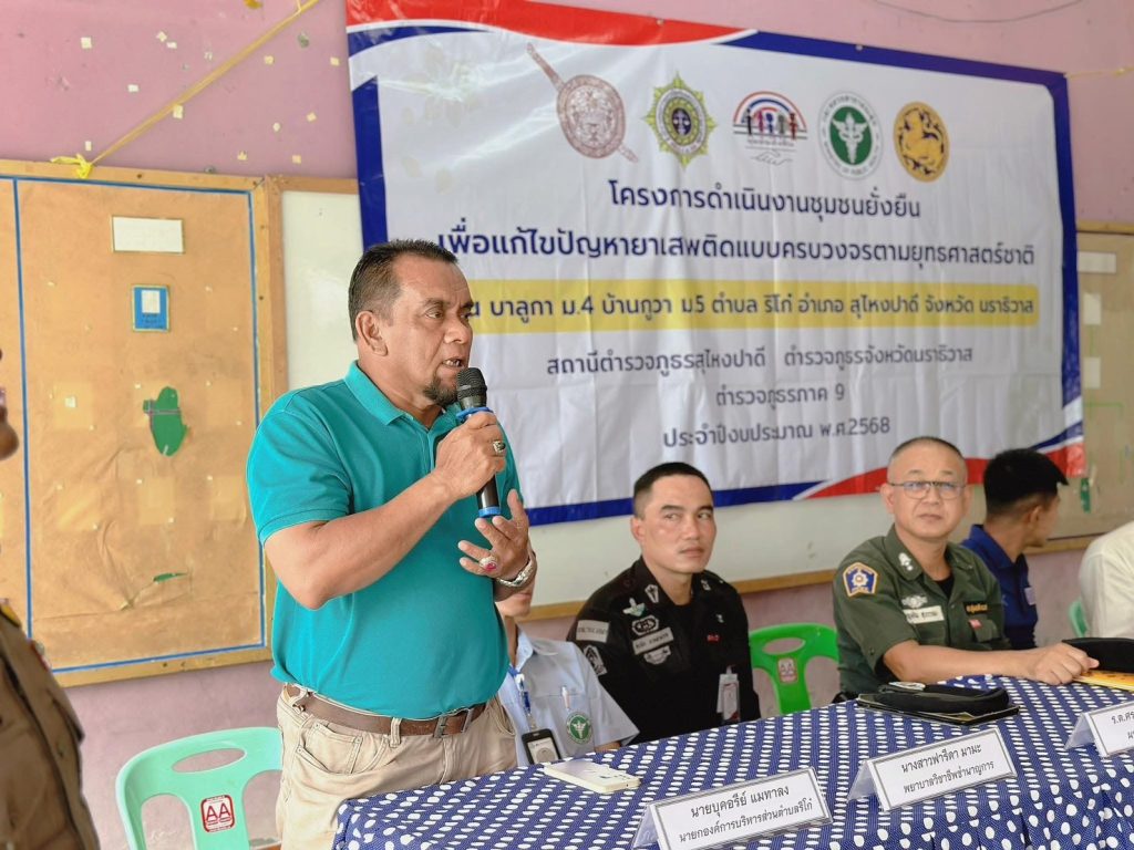 วันที่ 19 มีนาคม 2568 เวลา 14.00 นภายใต้การอำนวยการของ พ.ต.อ.มะตาฮา มูหนะผกก.สภ.สุไหงปาดี มอบหมายให้ พ.ต.ท.บุญเติม สุวรรณะ รอง ผกก.สส.สภ.สุไหงปาดี พ.ต.ท.ธีระศักดิ์ วิสมิตะนันท์ สว.อก.สภ.สุไหงปาดี พ.ต.ท.อุทัย สนิทชาติ สวป.สภ.สุไหงปาดี พร้อมชุดปฏิบัติการตำบลยั่งยืน สภ.สุไหงปาดี เจ้าหน้าที่ทหารพราน 4810 ,ฝ่ายปกครอง ,ตัวแทน รพ.สุไหงปาดี , กำนันตำบลริโก๋ , ผู้ใหญ่บ้าน ม.4 ม.5 ต.ริโก๋ ,อสม.,โต๊ะอีหม่าม และประชาชนในพื้นที่ ร่วมพิธีเปิดโครงการดำเนินงานตำบลยั่งยืน เพื่อแก้ไขปัญหายาเสพติดแบบครบวงจรตามยุทธศาสตร์ พร้อมลงนามบันทึกข้อตกลง MOU เพื่อแสดงถึงเจตนารมณ์ อันมุ่งมั่นตั้งใจที่จะร่วมกันแก้ไขปัญหายาเสพติดให้ปรากฏผลอย่างเป็นรูปธรรมและยั่งยืนตลอดไป โดยมี พ.ต.ท.บุญเติม สุวรรณะ รอง ผกก.สส.สภ.สุไหงปาดี ( รักษาราชการแทน ผกก.สภ.สุไหงปาดี ) เป็นประธานพิธีเปิด ณ อาคารโรงเรียนตาดีกาดารอลอิสละห์ ม.5 ต.ริโก๋ อ.สุไหงปาดี จ.นราธิวาส