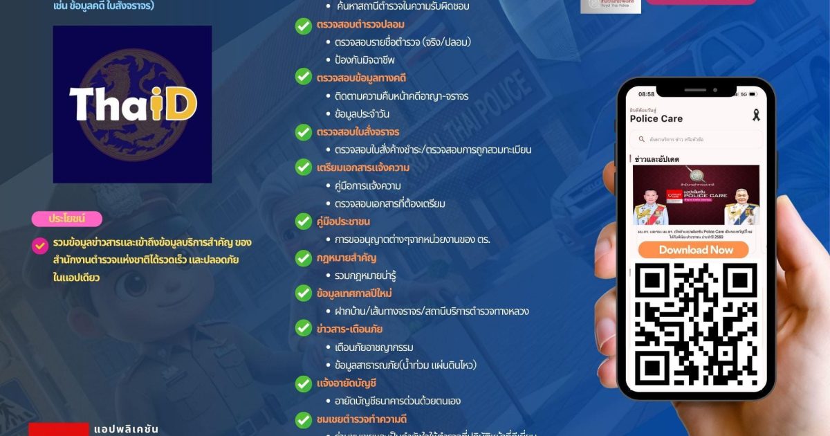 นอกจากนี้ ภายในแอปยังมีเมนูสำคัญด้านความปลอดภัย เช่น การร้องเรียนการปฏิบัติหน้าที่ของเจ้าหน้าที่ การแจ้งเบาะแสยาเสพติดผ่านสายด่วนป.ป.ส. ตลอด 24 ชั่วโมง ระบบ “ฝากบ้านไว้กับตำรวจ” เพื่อดูแลความปลอดภัยในช่วงที่ประชาชนไม่อยู่บ้านรวมถึงการแสดงข้อมูลจราจรและคำแนะนำการเดินทางในช่วงเทศกาลสำคัญ เช่น ปีใหม่และสงกรานต์